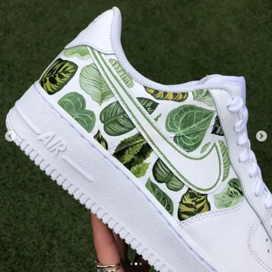 Bring nature to your step with these Botanical Leaf Air Force 1s. Featuring hand-painted green leaves, this custom sneaker adds a fresh, natural vibe to a timeless classic.