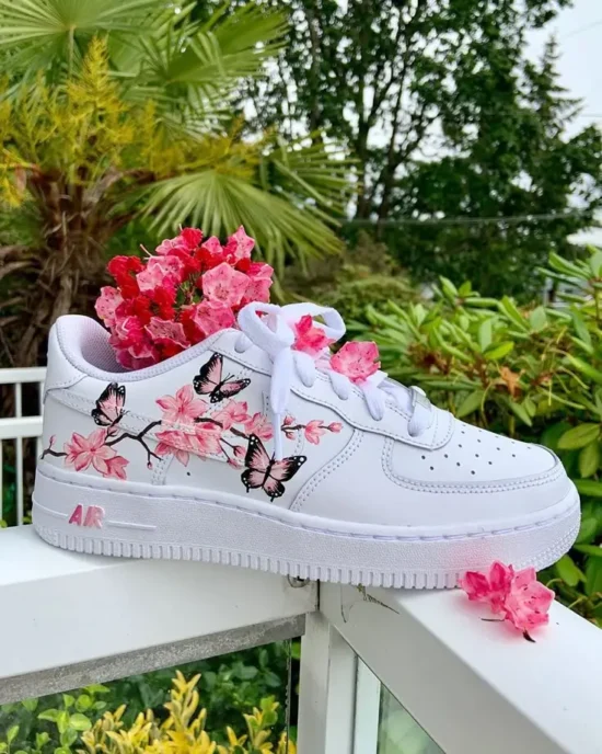 Capture the beauty of spring with these Cherry Blossom Air Force 1s. Adorned with delicate flowers and butterflies, each pair is hand-painted for a soft, feminine, and artistic finish.