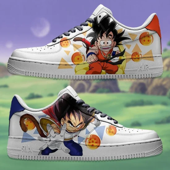 Custom sneakers featuring Kid Goku, Kid Vegeta, and Dragon Balls. A true blast from the past! 🐉👟